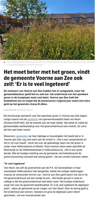Mooi groen!6 sep 2025Al geruime tijd horen wij van inwoners dat het groen er slecht bij staat en dat de plantsoenendienst nauwelijks zichtbaar is. Dit beeld herkennen wij uiteraard en daarom hebben wij dit, als afgevaardigden van de inwoners, aangekaart. Zeker omdat we hebben ontdekt dat de aanbesteding mogelijk niet correct is verlopen. Zowel inwoners als de raad hadden geen duidelijk beeld van wat er precies aan de hand was, waarom er buiten zo weinig gebeurde, en of het nog goed zou komen. Het college heeft inmiddels toegegeven dat er de afgelopen jaren te veel op het groen is bezuinigd en dat het onderhoud verbeterd moet worden. In december verschijnt het nieuwe groenbeleidsplan, waar wij goede hoop op hebben. Het eerder gepresenteerde groenstructuurplan zag er veelbelovend uit. Wat ons betreft hoort daar ook bij dat inwoners beter geïnformeerd worden. Samen kunnen we ervoor zorgen dat Voorne aan Zee weer het verzorgde en groene gezicht krijgt dat het verdient. Ondertussen zijn vanaf 1 september twee firma's aan de slag om de beeldkwaliteit van het groen weer op peil te brengen!